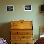 객실은 목재 가구와 카페트 바닥으로 장식되어 있습니다.